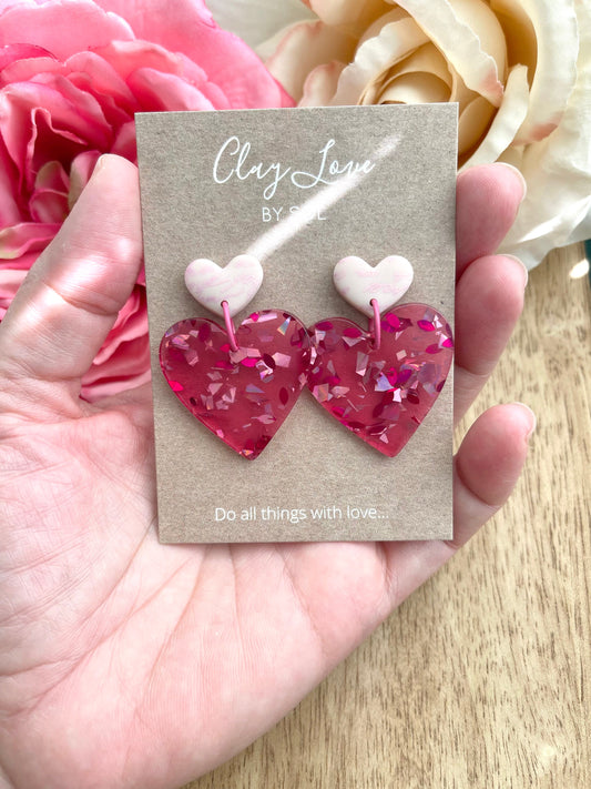 Polymer Clay Pink Large Heart Dangle Earrings, great for Valentine’s Day gift idea