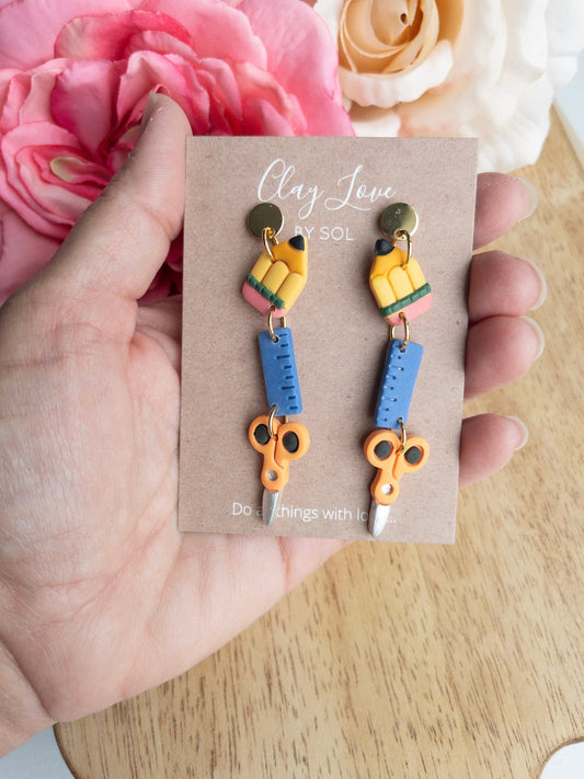 Pencil, Ruler, Scissors Polymer Clay Dangle Earring Trio, perfect for teachers or teacher gifts!
